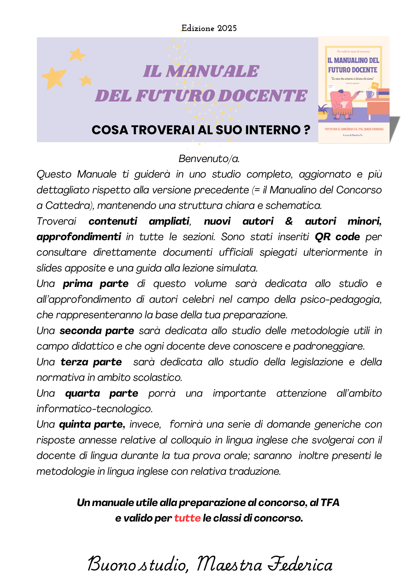 Ho superato il PNRR1 ma sono ancora una docente precaria, per tale motivo ho deciso di mettere a disposizione le mie competenze e tutto il mio studio all'interno del "Manualino del Concorso a Cattedra" e aiutare altri docenti come me.